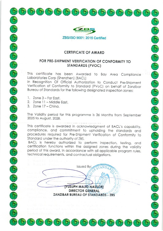 Since November 1, 2016, the Zanzibar Bureau of Standards (ZBS) has implemented the Verification of Conformity (PVoC) program. All exporters to Zanzibar must ensure their products undergo assessment and certification through the PVoC program before customs clearance at the port of entry. As an internationally recognized third-party testing and certification organization, BACL was officially authorized by ZBS in September 2025 to become the PVoC CoC issuing body for all general goods exported to Zanzibar from China (including Hong Kong, Macao and Taiwan), Japan, South Korea, North Korea, Mongolia, the Middle East and Southeast Asia. This can efficiently help manufacturers enter the Zanzibar and even the entire East African market!