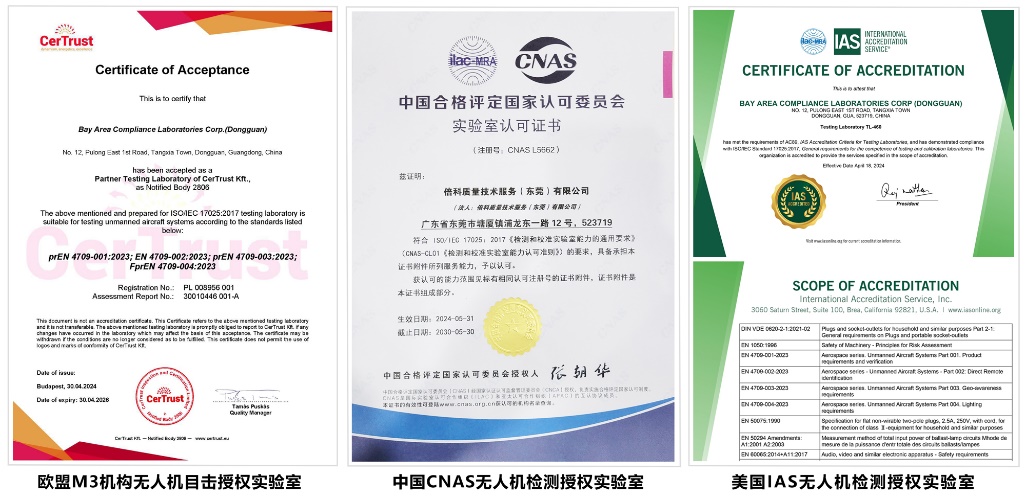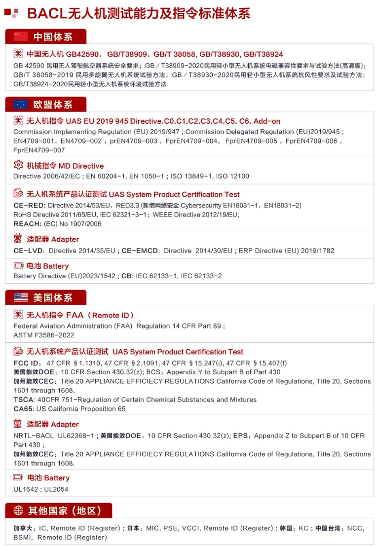 在无人机检测认证领域,BACL是国内极少数获得全套ISO 17025认证的综合第三方机构。我们在东莞设有飞行测试场地,配备专业博士团队及资深专业飞手,可一站式完成无人机系统产品EMC/RF/SAR/Safety、网络安全、飞行性能、可靠性、噪声和风洞等全套测试项目。此外,我们服务高效,可确保您在4-6周内获得欧洲发证。通过BACL检测认证,您的产品将确保符合CE法规(EU 2019/945,EU 2019/947)等国际标准,顺利进入目标市场。