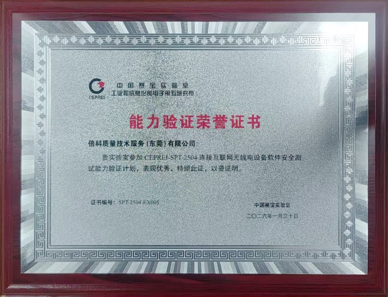 2026年1月30日,由中国赛宝实验室(工业和信息化部电子第五研究所)主办的2025年度能力验证总结暨优秀实验室表彰大会在广州盛大召开。BACL凭借过硬的技术实力及卓越的质量管控,荣获CEPREI-SPT-2504连接互联网无线电设备软件安全测试能力验证计划“能力验证荣誉证书”, 软件信息安全检测能力得到国家级权威认可!