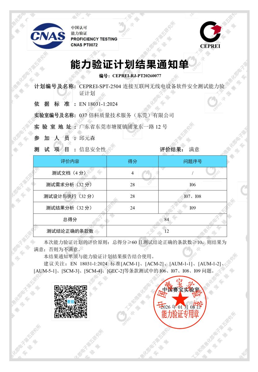 本次能力验证吸引了全国30多家检测机构参与,参评实验室需依据最新标准EN 18031-1:2024,对能力验证样机开展检测并提交测试结果。经综合评定,BACL斩获“满意”评价,成为少数高分通过的实验室之一。