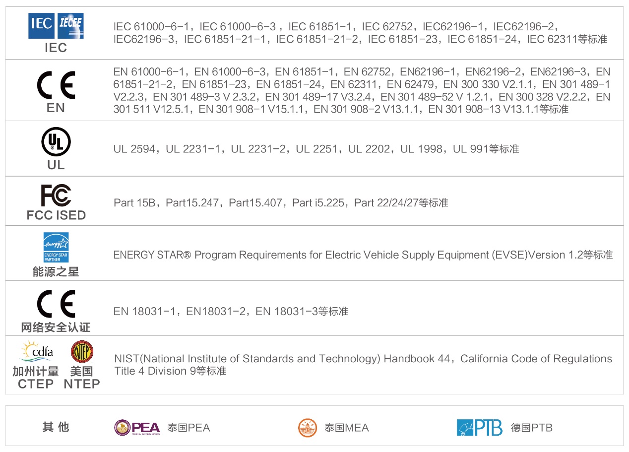我们的充电桩测试认证能力涵盖CE、FCC、能源之星、NTRA、CTEP、NTEP、PTB、PEA、MEA等。
