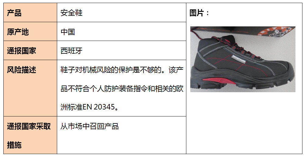 该款安全鞋因机械保护不充分而被召回。所以制造商必须引起足够的重视,采取必要的措施以保证其产品符合法规和标准要求,如在产品运输到其它国家之前将产品送到具有资质的专业实验室做测试,以确保出口其它国家.
