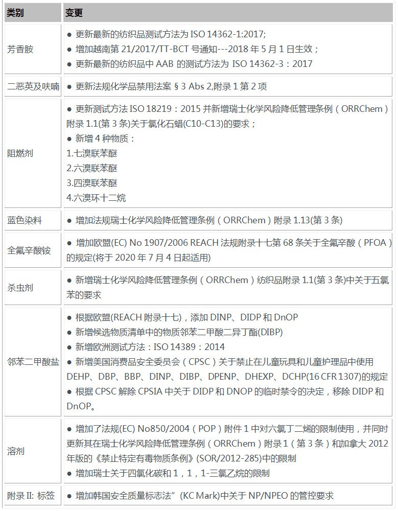 清单包括12大类约250多种化学物质。AAFA限用物质清单涵盖了服装、家纺和鞋类中的限用化学品,并引用了最严格的政府法规或法律。19版RSL具体更新如下: