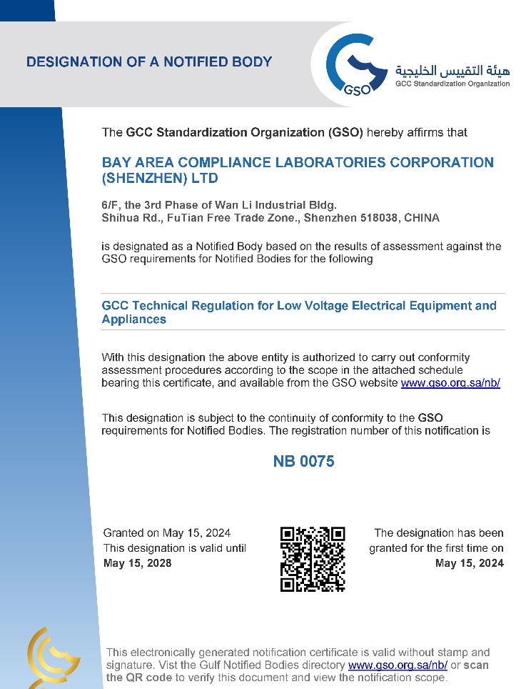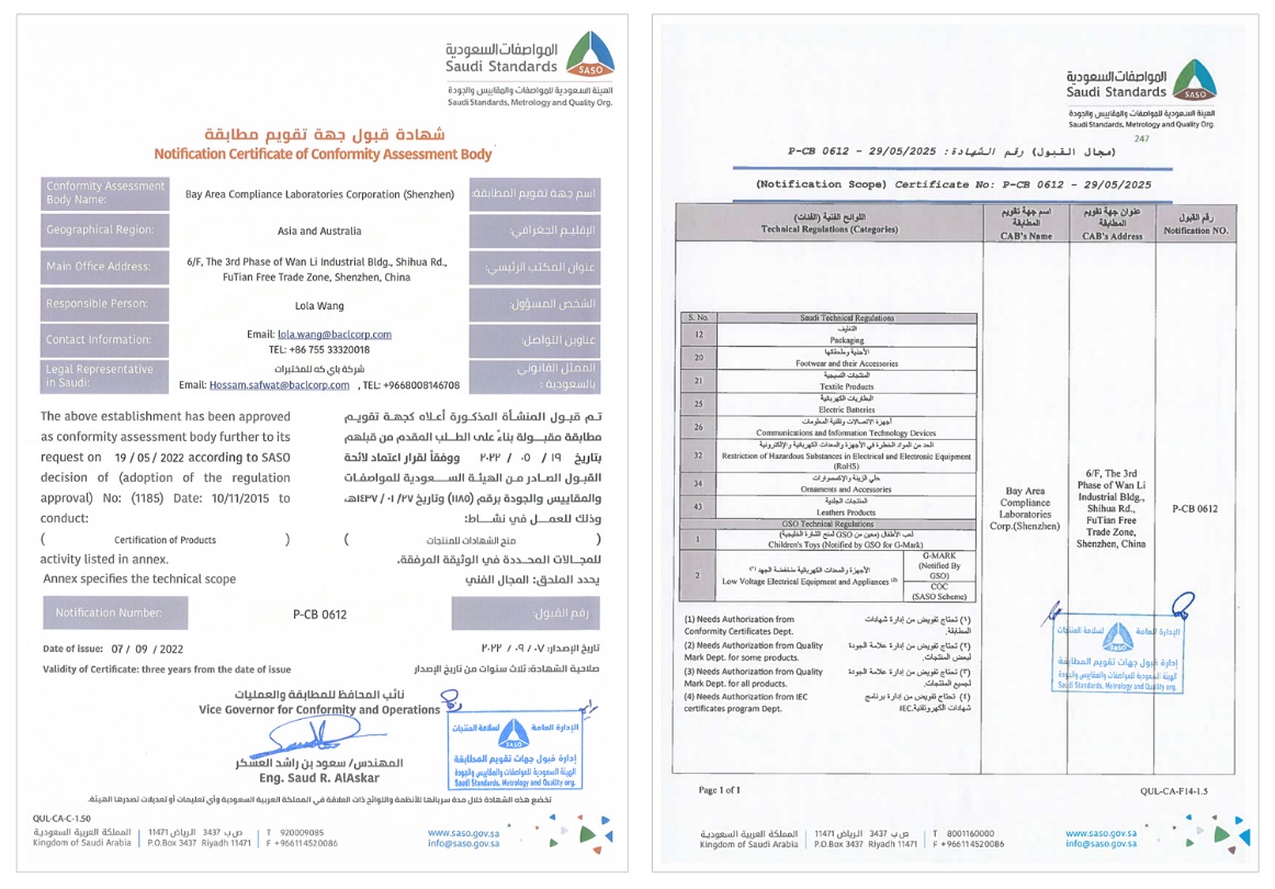 同时,BACL也是GSO认可的NB公告机构和SASO官方认定的发证机构,可为广大客户提供LVE产品的SASO发证服务及颁发G-Mark认证;我们在中东地区审核发证方面拥有丰富的经验,能帮助您顺利获得证书出口货物到中东,高效拓展中东市场。
