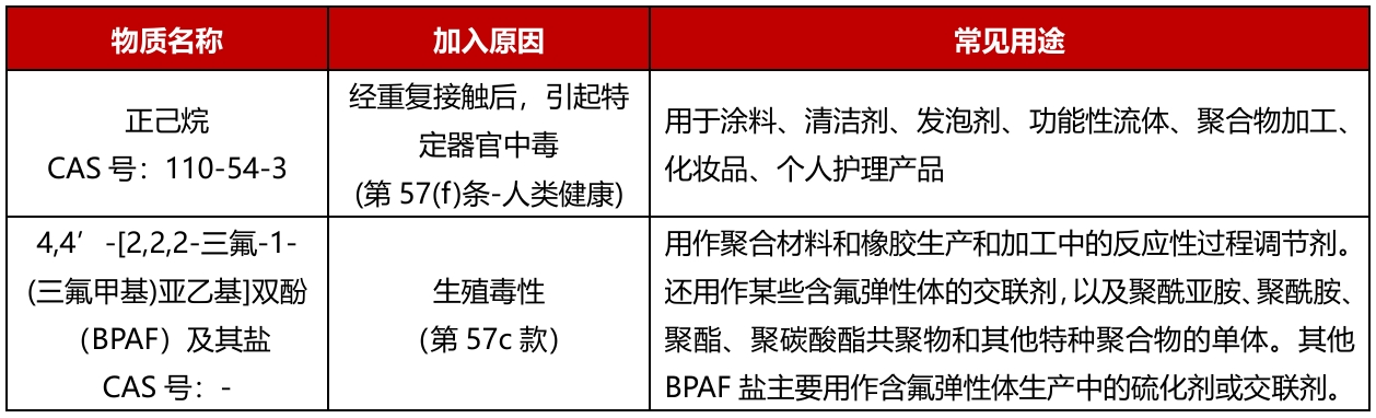 2026年2月4日,欧洲化学品管理局(ECHA)正式将正己烷和4,4’-[2,2,2-三氟-1-(三氟甲基)亚乙基]双酚(BPAF)及其盐两项物质纳入REACH高度关注物质(SVHC)清单。与此两项物质同时进行评议的4,4’-二羟基二苯甲烷(双酚F,BPF)被撤回,未被纳入SVHC物质清单。至此,REACH高度关注物质清单正式增至253项。