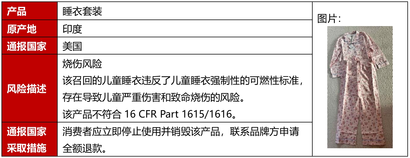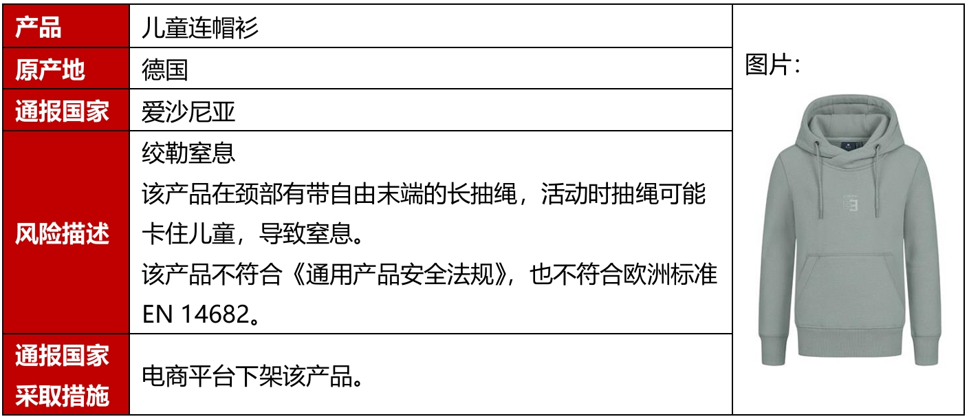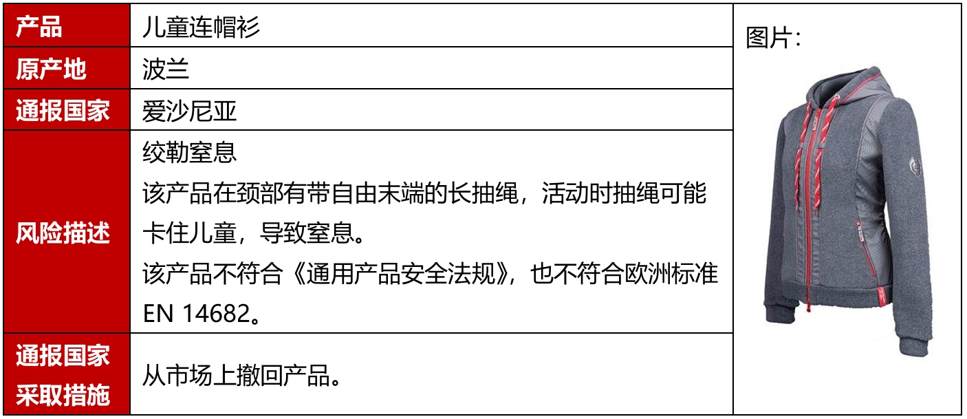 2026年1月,欧洲、美国公布5起纺织及服装产品召回案例,其中有2例产自中国。召回的原因包括绞勒窒息、烧伤等危害。
