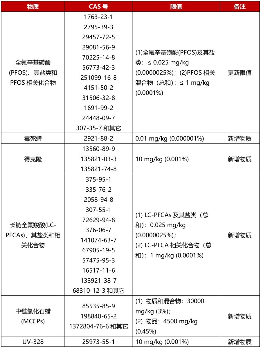 2026年3月18日,英国环境、食品与农村事务部(DEFRA)提议修订UK POPs法规(The Persistent organic Pollutants (Amendment) Regulations),拟增加毒死蜱、得克隆、LC-PFCAs、MCCPs和UV-328五项物质,并修订现有物质PFOS的限值。该草案提议从2026年12月16日开始执行。
