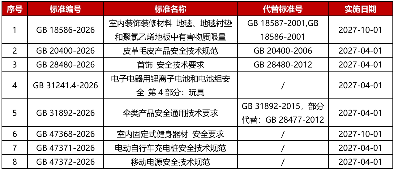 2026年3月31日,中国国家市场监督管理总局(国家标准化管理委员会)发布2026年第14号国家标准公告,批准发布了GB 20400-2026《皮革毛皮产品安全技术规范》、GB 28480-2026《首饰安全技术要求 》、GB 31892-2026《伞类产品安全通用技术要求》、GB 18586-2026《室内装饰装修材料 地毯、地毯衬垫和聚氯乙烯地板中有害物质限量》等20项强制性国家标准。