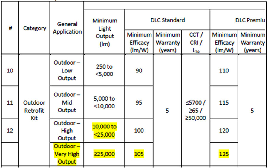 ※ Outdoor产品增加了“Very high output”应用栏要求(包括Retrofit kit),见黄色部分: