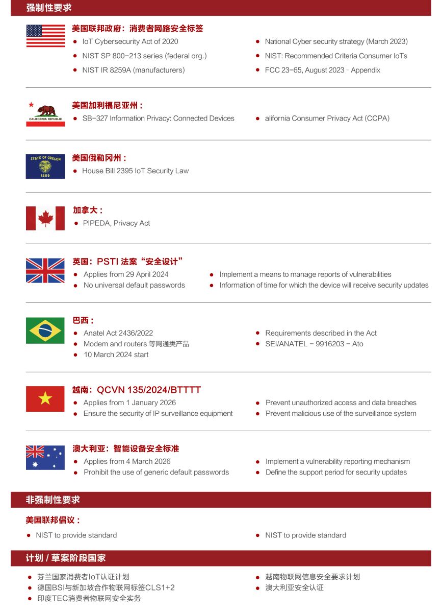 随着欧盟、美国、加拿大、英国等全球主要经济体强制网络安全法规加速落地,测试认证已成市场准入核心门槛。构建数字信任基石,企业须以认证为盾突破合规壁垒,更将其转化为抢占国际市场的竞争优势。