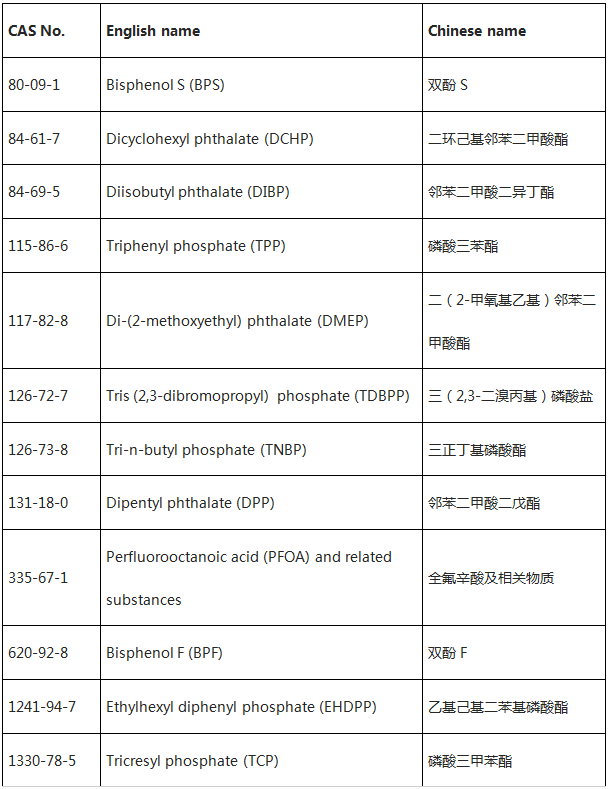 The newly added 20 chemicals including 13 Flame retardant, 4 Phthalic, Bisphenol S (BPS), Bisphenol F (BPF) and Perfluorooctanoic acid (PFOA).