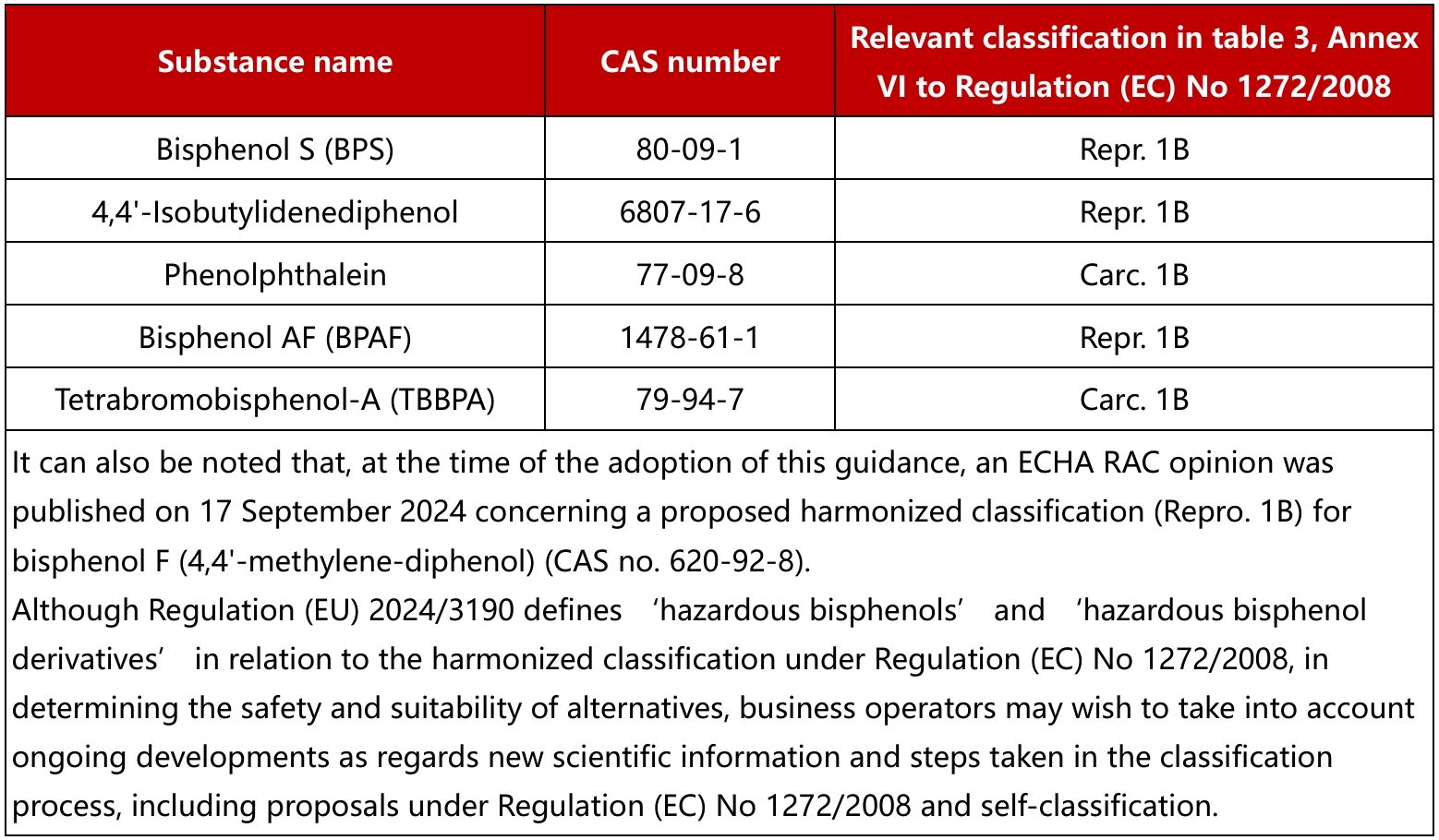 - Besides BPA, any bisphenol/bisphenol derivative with a harmonized classification as CMR 1A/1B or ED 1 under (EC) No 1272/2008 is banned. This document is summarized as follows: