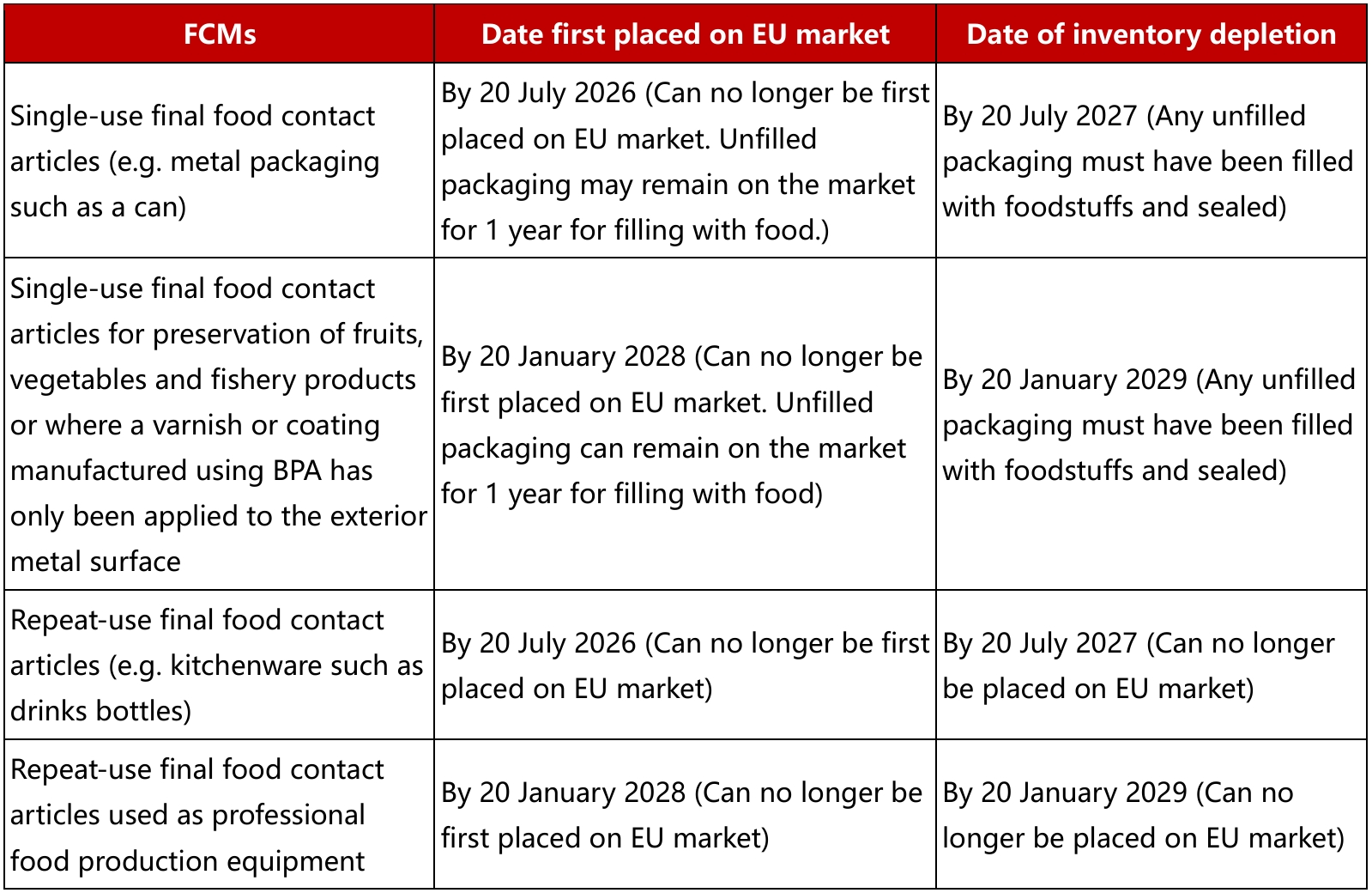 - BPA derivatives such as BADGE (CAS No 1675-54-3) are not specifically banned. However, compliance with Article 4 is required, meaning no residual BPA can be present in the final FCMs.