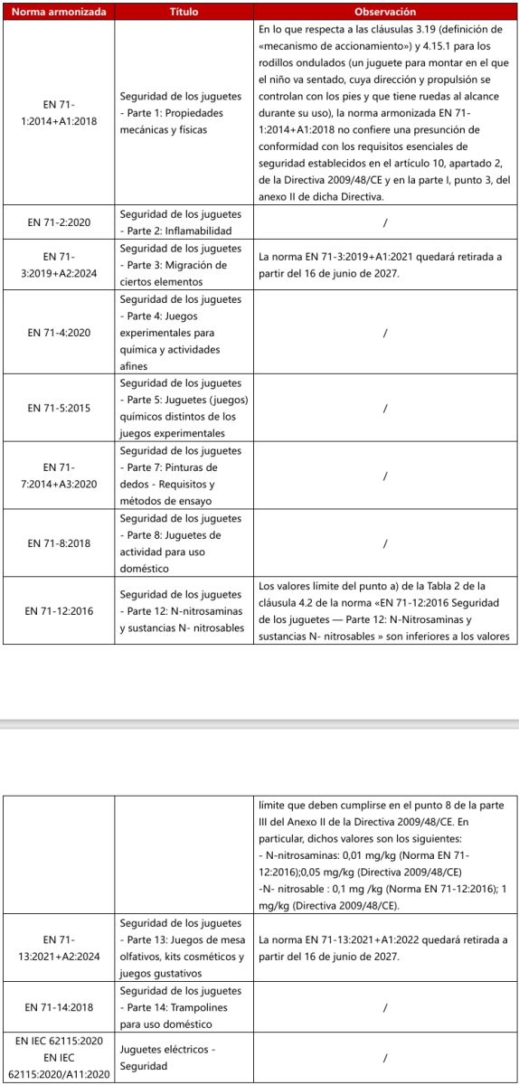 El 16 de diciembre de 2025, la Comisión Europea publicó la Decisión de Ejecución (UE) 2025/2519 para actualizar las referencias a las normas armonizadas de la Directiva 2009/48/CE sobre seguridad de los juguetes. Con efecto inmediato (a partir del 16 de diciembre de 2025), las normas EN 71-3:2019+A2:2024 y EN 71-13:2021+A2:2024 se incluirán como normas armonizadas de la Directiva 2009/48/CE sobre seguridad de los juguetes. Las versiones anteriores EN 71-3:2019+A1:2021 y EN 71-13:2021+A1:2022 quedarán retiradas a partir del 16 de junio de 2027 .