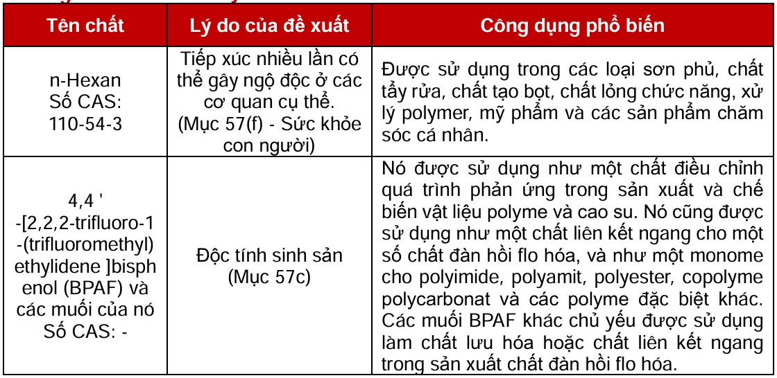 Vào ngày 15 tháng 12 năm 2025, Ủy ban các quốc gia thành viên (MSC) của Cơ quan Hóa chất Châu Âu (ECHA) đã nhất trí tại cuộc họp tháng 12 của mình để chỉ định n-hexane là một chất gây lo ngại cao (SVHC). Đây là chất đầu tiên được xác định để đưa vào danh sách các chất SVHC tiềm năng do độc tính thần kinh (thay vì các loại truyền thống như gây ung thư, gây đột biến hoặc độc tính sinh sản). Ngoài ra, 4,4'-[2,2,2-trifluoro-1-(trifluoromethyl) ethylidene ]bisphenol (BPAF) và các muối của nó đã được thêm vào danh sách các chất SVHC tiềm năng mà không cần thảo luận của ủy ban. ECHA dự kiến sẽ bổ sung hai chất này vào danh sách SVHC vào tháng 2 năm 2026, thời điểm danh sách SVHC của REACH sẽ chính thức tăng lên 253 chất.