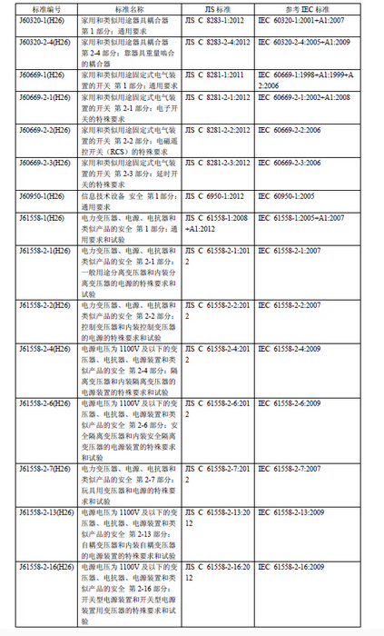 为了具体规范出符合《电气用品技术基准的省令》(2013 年经济产业省令第34 号)所规定的技术要求的内容,2014 年4 月14 日,日本经济产业省特制定了《电气用品技术基准的省令解释》(20130605 商局第3 号)。在该解释文件的附录别表第十二中,规范了以国际标准为主,整合的公定标准并整合了技术基准省令。
