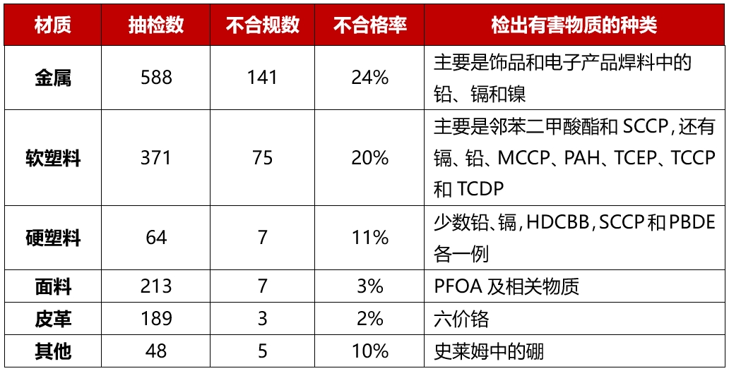 2023年12月,欧洲化学品管理局(ECHA)发布REF-10执法行动报告,此次行动共检查了 2400多种消费产品,发现被抽检产品中有400多种产品含有过量的有害化学物质,总体不合规率为 18%,超六分之一。