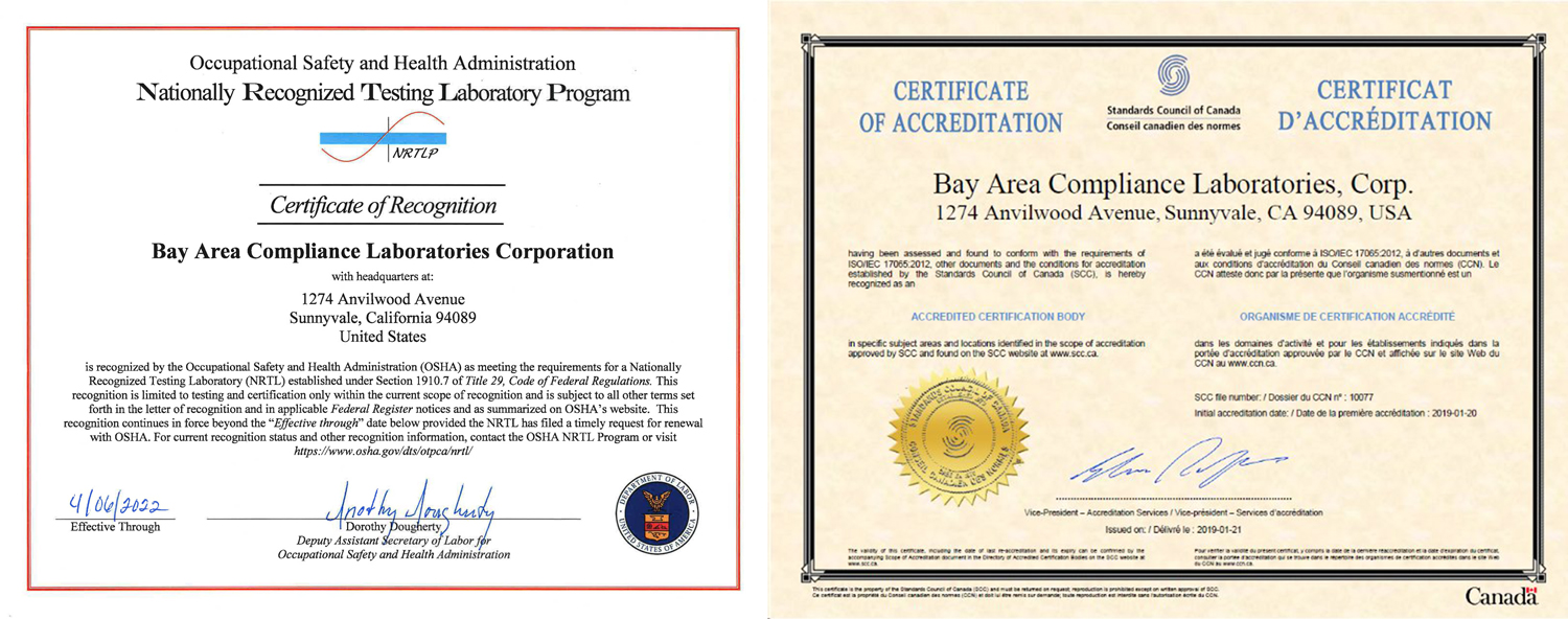 BACL是美国OSHA和加拿大SCC双认可的北美安规认证机构,欧盟CE认证的通告机构(Notified Body: 1313),IECEE CB Scheme的认证机构NCB和测试实验室CBTL(CB102, TL730);同时还获得A2LA, IAS, CNAS, CMA, FDA, ACMA, SAA等场地授权和认可,分别在美国、韩国、中国台湾、深圳福田和南山、东莞、成都、昆山等地设有安规测试实验室,可为您提供IT/AV, HOUS、照明产品、电源产品、电动工具等产品的全球认证包括:美国(NRTL, FCC, ENERGY STAR, FDA, DOE, CEC), 加拿大(SCC, ISED, NRCan),欧盟(CE), 韩国(KC), 欧盟CE NB, 国际电工委员会IECEE CB Scheme, 日本(MIC), 新加坡(IMDA), 中国香港(OFCA),中国台湾(NCC, BSMI), 埃及(NTRA, GOEIC), 越南(MIC), 沙特(SASO), 菲律宾(NTC),泰国(NBTC), 马来西亚(SIRIM), 印度(BIS, WPC, TEC)等多国家及地区的认证服务,保障您的产品在国际贸易壁垒日趋激烈的今天,依然顺利的进入国际贸易市场!