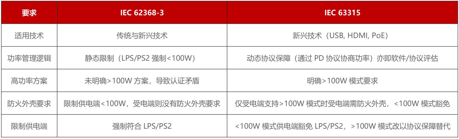 新旧技术的混合要求,本来就容易造成适用范围的混乱。加之新技术的快速发展,如USB PD 3.1功率突破引发标准失效,即当USB PD 3.1支持EPR(Extended Power Range)模式,功率提升至240W(48V)后,传统LPS/PS2(限功率源)要求(<100W)不再适用。IEC 62368-3无法解决高功率下的安全矛盾,例如防火外壳要求与协议管理的脱节。