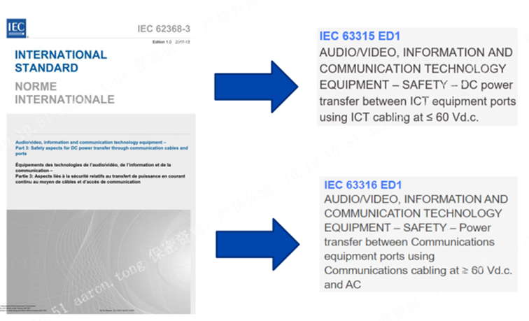事实也是早在2019年IEC TC 108就提出将IEC 62368-3拆分成两个标准,以期修订相关要求和适应新技术的发展。如下IEC 63315是针对USB、HDMI、PoE等新兴技术的安全要求,IEC 63316则是针对传统电话线路RFT电路技术的安全要求。