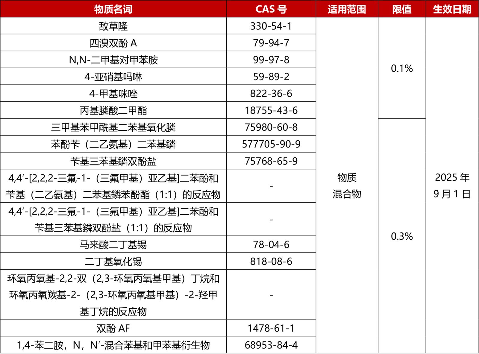 此次修订新增了16项1B类CMR物质和1项豁免条款。