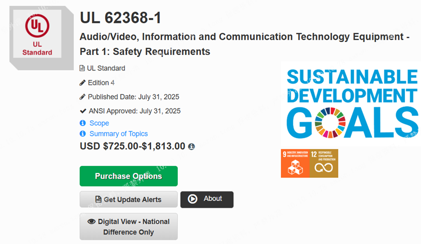 继国际标准IEC 62368-1:2023(第四版)与欧盟标准EN IEC 62368-1:2024(第四版)相继发布后,美国标准UL 62368-1:2025(第四版)于2025年7月31日正式发布,并于当日被美国国家标准学会(ANSI)采纳为美国国家标准。