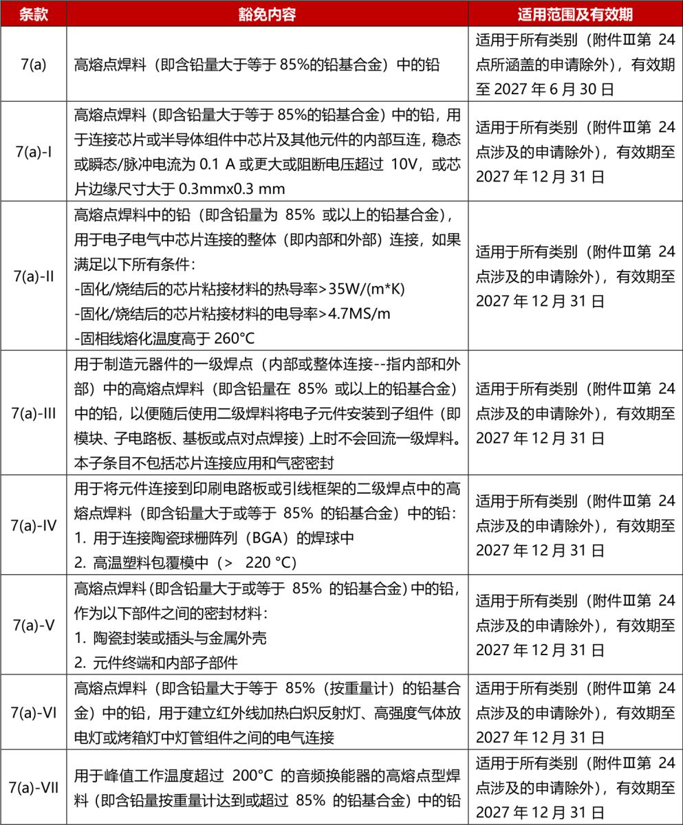 关于玻璃陶瓷电气电子元件,RoHS指令附录III的7(c)-I和7(c)-II豁免条款被替换,并新增7(c)-V和7(c)-VI豁免条款: