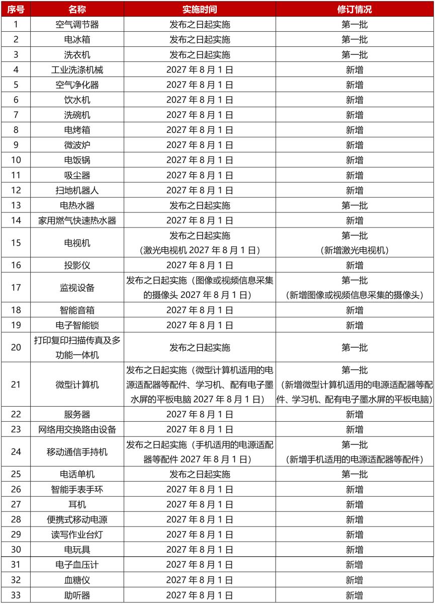 在广泛调研论证的基础上,将第一批12 种产品优化整合为10 种(原有的打印机、复印机、传真机3 种产品根据技术发展情况合并为打印复印扫描传真及多功能一体机),新增23 种管控条件较为成熟的产品纳入。调整后,《达标管理目录》内共计包含33 种产品,均为消费者日常生活中使用场景多、使用频次高的电器电子产品。