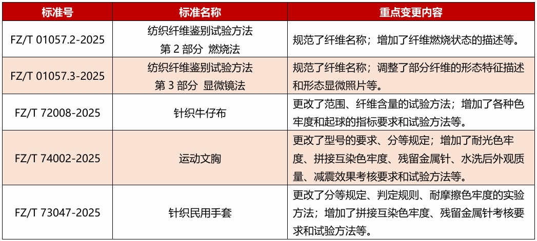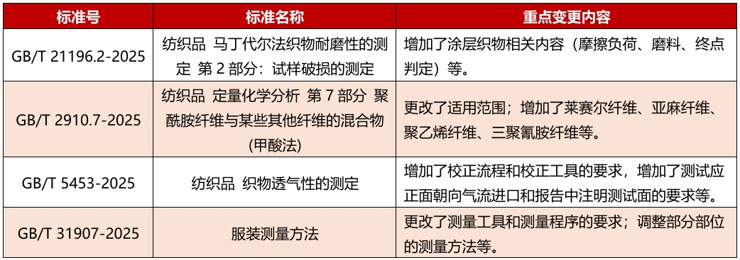 2025年,中华人民共和国工业和信息化部、国家市场监督管理总局(国家标准化管理委员会)发布了一批纺织品、服装及相关产品的检测方法与执行标准的新版本。新版本2027年开始实施,在实施日期前的两年多过渡期内,新旧版标准可并行使用。主要内容汇总如下: