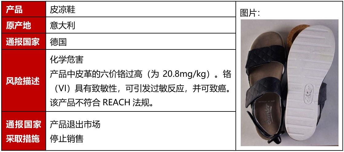 2025年10月,欧盟、美国、加拿大和澳洲共发生1例鞋类召回案例。该召回发生在欧盟,且是因为存在化学危害被召回的。