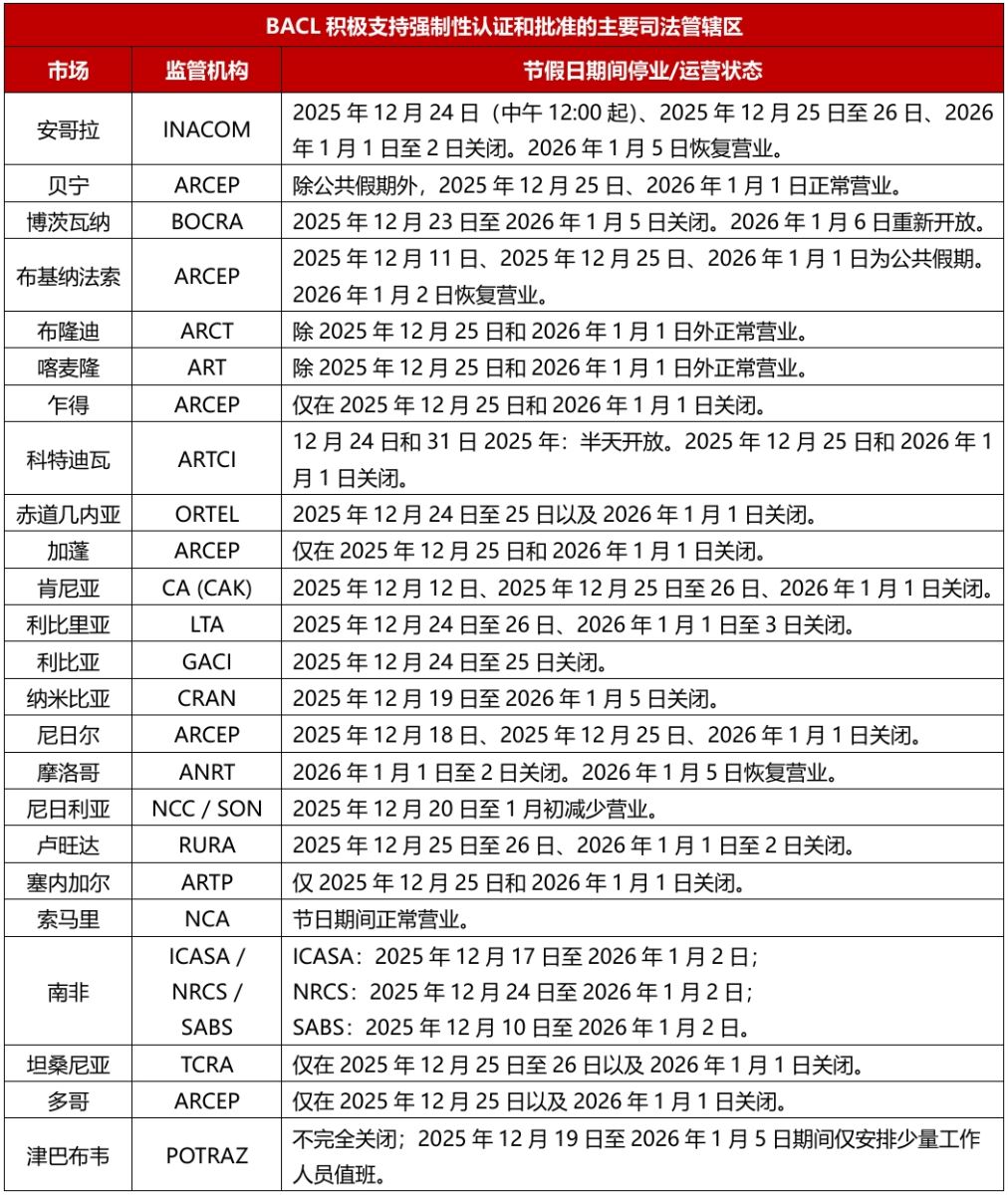 非洲的强制性审批体系完善、结构化,并与政府的运作时间表紧密相关。凭借BACL的服务覆盖、权威机构关系以及积极主动的规划支持,中国/亚洲出口商可从容应对这些时间节点。如果能够提前预估年度节假日,并合理协调各区域的认证周期,合规项目就能保持顺畅、高效且具有商业可靠性。
