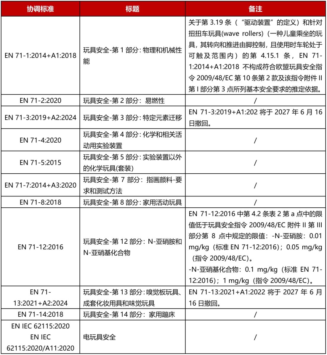 2025年12月16日,欧盟委员会发布了执行决议(EU) 2025/2519,更新玩具安全指令(2009/48/EC)参照的协调标准清单,即日(2025年12月16日)起,EN 71-3:2019+A2:2024和EN 71-13:2021+A2:2024被列为玩具安全指令的协调标准。先前版本EN 71-3:2019+A1:2021和EN 71-13:2021+A1:2022将于2027年6月16日撤回。