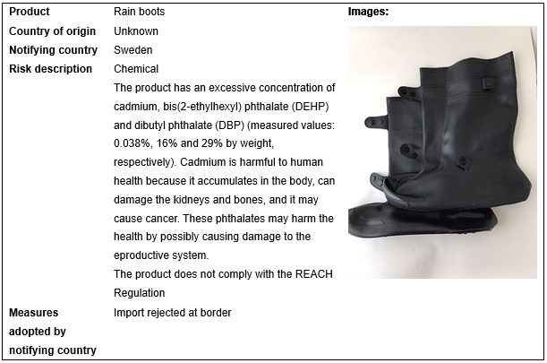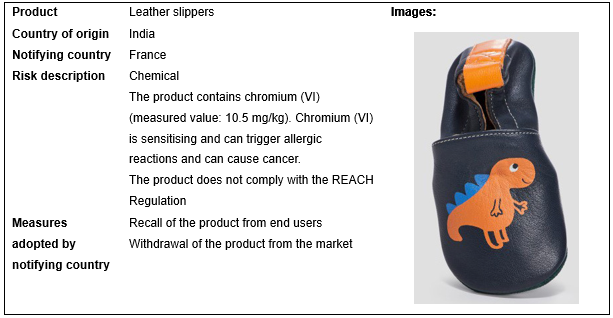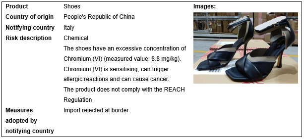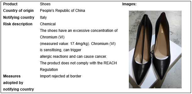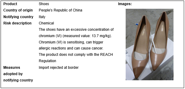 European Union, USA, Canada and Australia recall 6 batches of footwear products in May 2023. These recalls occurred in EU, and are caused by chemical problem.