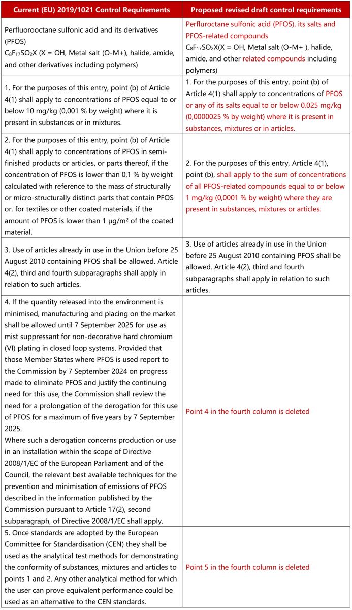 The comparison between the current control requirements of PFOS and the proposed revised content of the draft is as follows: