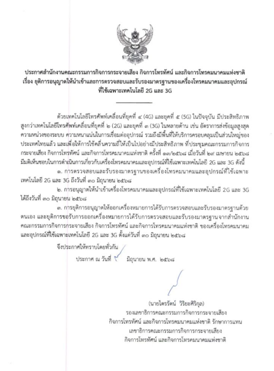 Recently, the National Broadcasting and Telecommunications Commission (NBTC) of Thailand announced a significant regulatory change today, Beginning June 30, 2025, the importation of telecommunications equipment and devices that operate solely on 2G and 3G networks will be officially prohibited. Additionally, the NBTC will no longer issue inspection and certification marks for such devices.