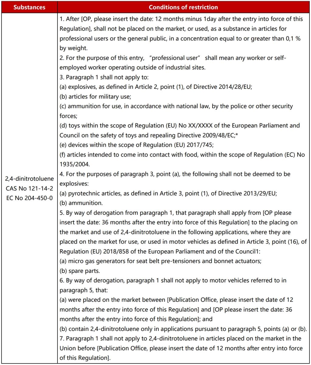 On 15 September 2025, the World Trade organization (WTO) circulated a proposal from the European Union announcing its intention to add an entry on 2,4-dinitrotoluene in Annex XVII to Regulation (EC) No 1907/2006 (REACH).