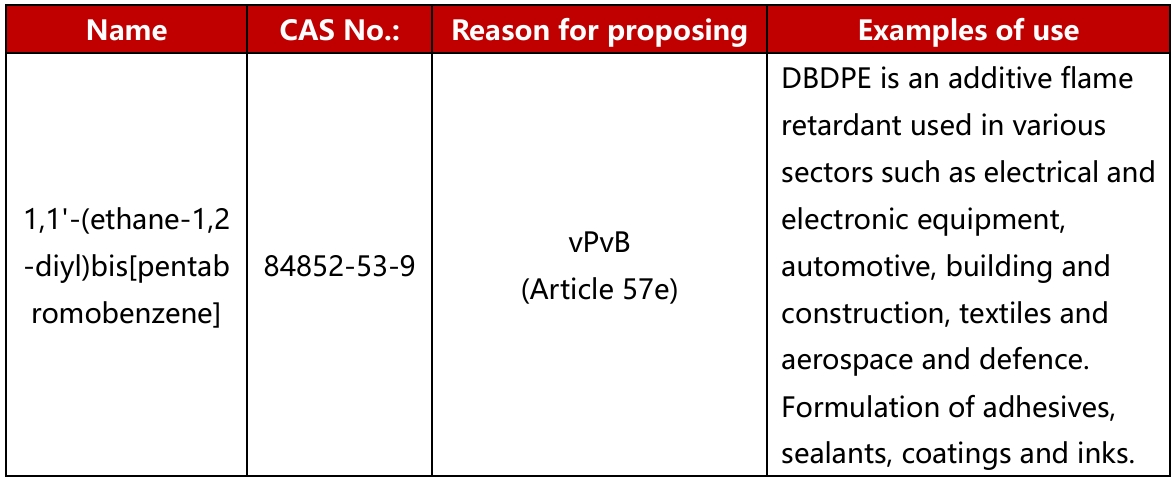 On October 9, 2025, the European Chemicals Agency (ECHA) announced that the Member State Committee (MSC) agreed at the October meeting to identify 1,1'-(ethane-1,2-diyl)bis[pentabromobenzene] (DBDPE) (EC 284-366-9, CAS 84852-53-9) as a substance of very high concern, SVHC, because of its very persistent and very bioaccumulative (vPvB) properties. ECHA plans to formally include the substance in the list of substances of very high concern (SVHC) in November, when the number of SVHC will increase from 250 to 251.