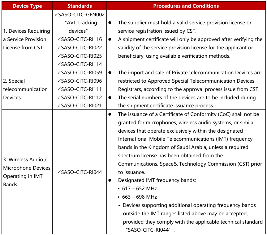 5. For devices that require conformity involves additional requirements from CST, such as obtaining a license or prior registration, the additional requirements for the applicant must be verified: