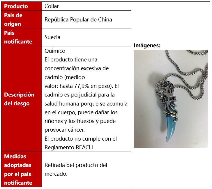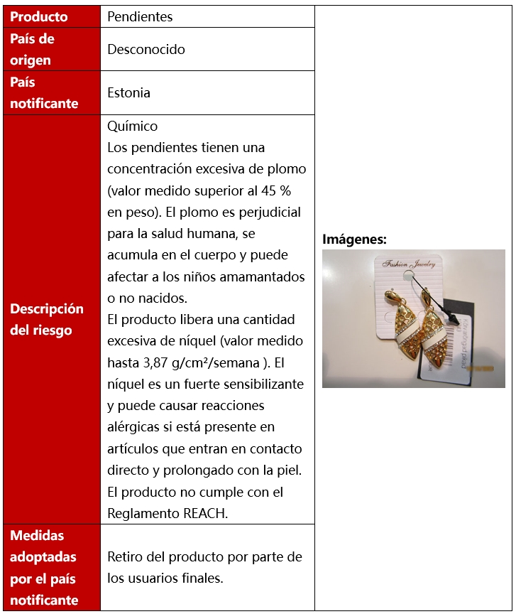 La Unión Europea, EE. UU., Canadá y Australia retiraron del mercado 4 lotes de joyas del 20 al 23 de noviembre. Estos retiros se produjeron en la UE y son causados por un exceso de metales pesados .