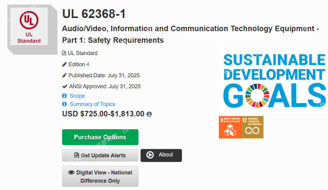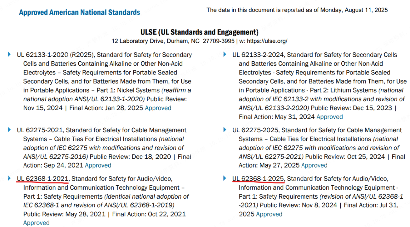국제 표준 IEC 62368-1:2023 (제4판) 및 EU 표준 EN IEC 62368-1:2024 (제4판) 이 잇달아 발표된데 이어,미국 표준 UL 62368-1:2025 (제4판) 이 2025년 7월 31일 정식으로 발표되었으며,같은날 미국 국가표준협회(ANSI) 에 의해 미국 국가 표준으로 채택되었습니다.