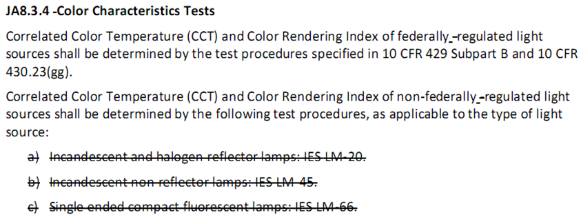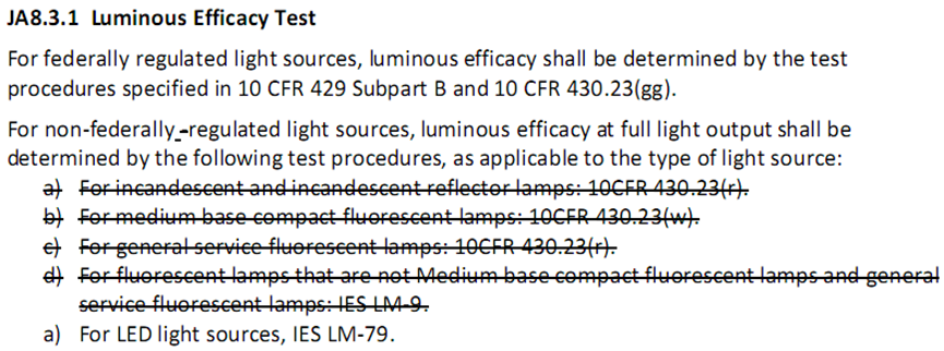 업데이트 1: 연방 규제 대상이 아닌 광원의 광효율 테스트에서 백열등과 형광등 두 가지 제품 테스트 방법을 삭제했습니다.