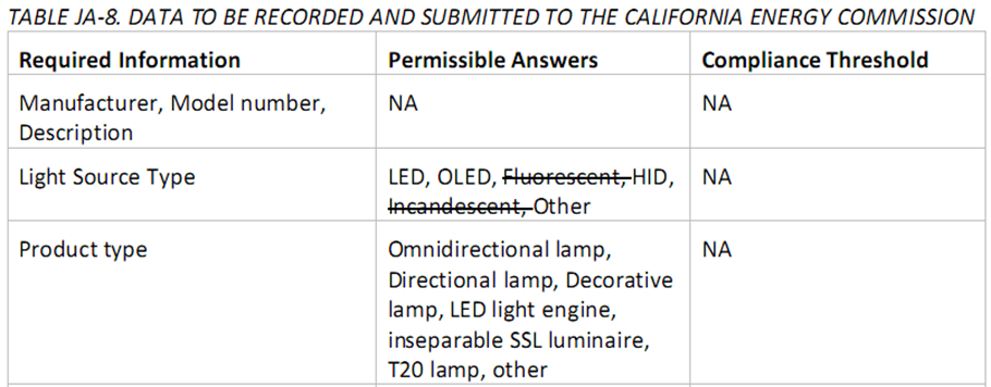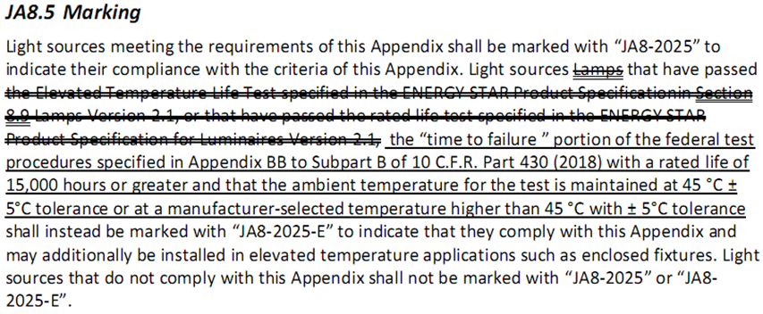 업데이트 5: 표시(Marking)는 JA8-2025 또는 JA8-2025-E로 업데이트되며, 광원은 DOE의 10 C.F.R. Part 430 Subpart B의 Appendix BB에 따른 수명 노화 방법을 적용합니다. 단, 노화 환경 온도가 45°C±5°C이거나 제조업체가 더 높은 노화 온도를 선택한 경우에만 JA8-2025-E 표시를 사용할 수 있습니다.