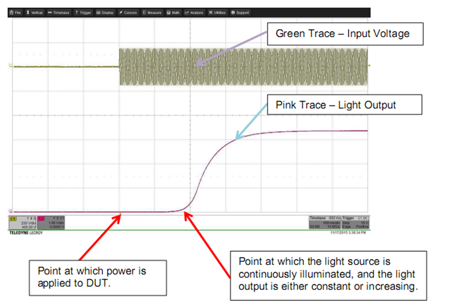 제품에 전원을 공급해 광원이 안정적으로 발광할 때까지 걸리는 시간.(모션 센서, 광센서, 무선 제어, 대기 모드, 연결 기능) 등 내장 제어기가 있는 경우, 해당 기능을 비활성화한 상태에서 시험해야 함.