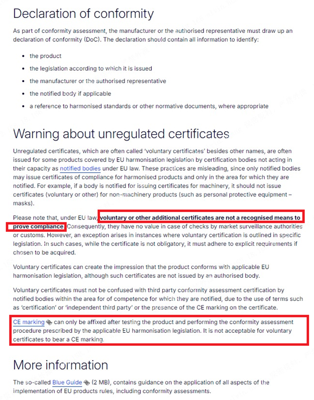 Ủy ban Châu Âu đã nhấn mạnh các yêu cầu cụ thể về đánh giá sự phù hợp của sản phẩm trên trang web chính thức của mình và đặc biệt chỉ ra rằng các từ như "chứng nhận" và "bên thứ ba độc lập" không được sử dụng trong các chứng chỉ tự nguyện và nhãn hiệu CE bị nghiêm cấm .