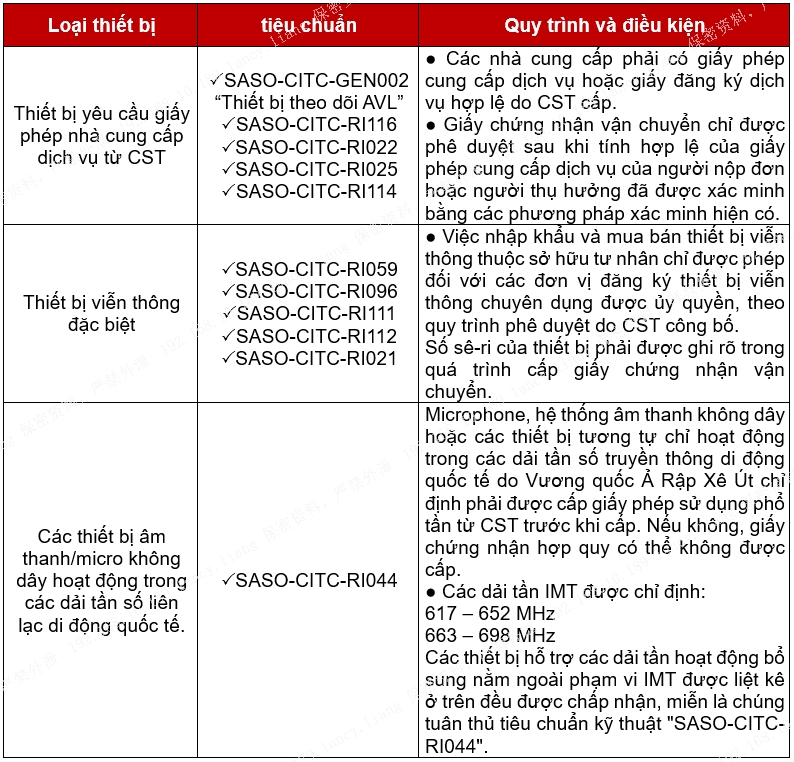 • Các sản phẩm đó phải đáp ứng tất cả các yêu cầu kỹ thuật của CST trong tiêu chuẩn kỹ thuật "SASO-CITC-GEN002" và cung cấp mẫu biên nhận hợp quy thiết bị (đính kèm) để kiểm tra.